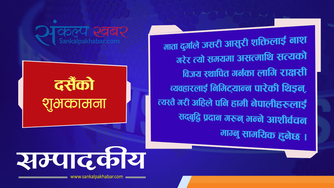 हामी यसअवसरमा सम्पूर्ण पाठक ,विज्ञापन दाता, लेखक, समाचारदाता तथा सम्पूर्ण नेपालीहरुमा विजया दशमीको पावन अवसरमा, बडा दसैँको यो महान पर्वमा सबैलाई माता दुर्गाले आशीर्वाद दिऊन् र मुलुकले नयाँ दिशा प्राप्त गर्नका लागि पनि माताको आशीर्वाद प्राप्त होस् भन्ने शुभकामना व्यक्त गर्दछौँ । बडा दसैँको शुभकामना ।