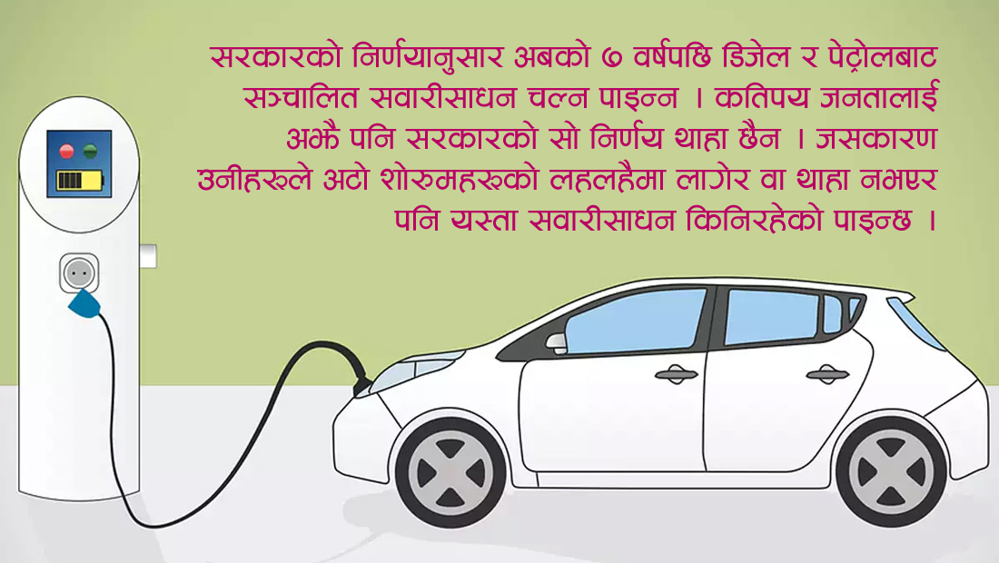 २०८८ सालपछि सरकारले पेट्रोल र डिजेलबाट चल्ने सवारीसाधनको रोडपर्मिट र दर्ता खारेज गरिदिनेछ । त्यसैले सरकारले दश वर्षअघि नै यसबारे जनतालाई सचेत गराएको छ । तर, जनता मनोमानी ढंगले यस्तो सवारीसाधन किन्छन् भने त्यसमा राज्यको केही दोष रहँदैन । अटो शोरुमहरूको पोलिसीमा सर्वसाधारण फसिरहेका छन् अनि बैंक डुबिरहेका छन् । सरकारी निर्णय बेवास्ता गरेर धमाधम कर्जा प्रवाह गर्दा अधिकांश बैंक डुब्ने अवस्थामा पुगेका छन् । सरकारको निर्णयलाई मध्यनजर गर्दै विद्युतीय सवारीसाधन किनौं र लगानी गरौं । अब सर्वसाधारण जनता आफैं सचेत बन्नुपर्छ । पेट्रोल र डिजेलबाट चल्ने सवारीसाधन बेच्ने अटो शोरुमको पछि नलागौं