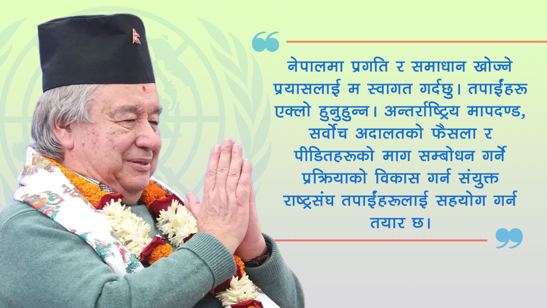तपाईंहरू एक्लो हुनुहुन्न । अन्तर्राष्ट्रिय मापदण्ड, सर्वोच अदालतको फैसला र पीडितहरूको माग सम्बोधन गर्ने प्रक्रियाको विकास गर्न संयुक्त राष्ट्रसंघ तपाईंहरूलाई सहयोग गर्न तयार छ ।’राष्ट्रसंघका महासचिव गुटेरेस बुधबार न्युयोर्क फर्केलगत्तै प्रधानमन्त्री पुष्पकमल दाहाल प्रचण्ड, नेपाली कांग्रेसका सभापति शेरबहादुर देउवा र एमाले अध्यक्ष केपी ओलीबीच बालुवाटारमा छलफल भयो । छलफलको एक मात्र उद्देश्य शान्ति प्रक्रियाका बाँकी काम टुंगो लगाउन रहेको ओलीले बताएका छन् ।