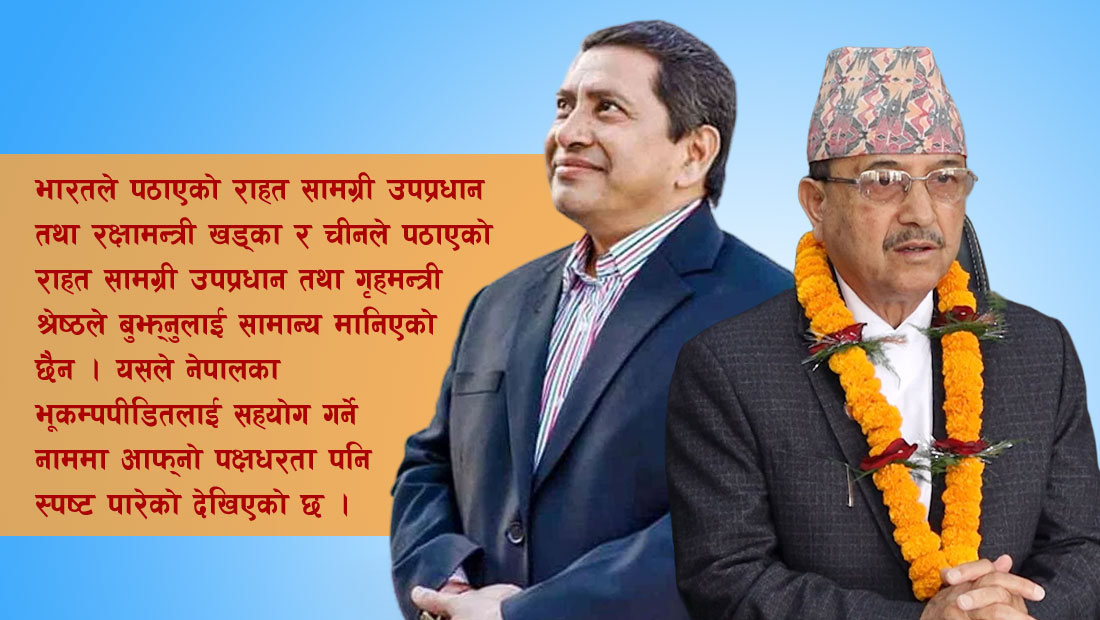 भारतले पठाएको राहत सामग्री उपप्रधान तथा रक्षामन्त्री खड्का र चीनले पठाएको राहत सामग्री उपप्रधान तथा गृहमन्त्री श्रेष्ठले बुझ्नुलाई सामान्य मानिएको छैन । यसले नेपालका भूकम्पपीडितलाई सहयोग गर्ने नाममा आफ्नो पक्षधरता पनि स्पष्ट पारेको देखिएको छ । यसबाट भारतीय संस्थापन पक्ष कांग्रेससँग नजिक भएको र चिनियाँ संस्थापन पक्ष कम्युनिस्ट नजिक भएको स्पष्ट हुन्छ ।