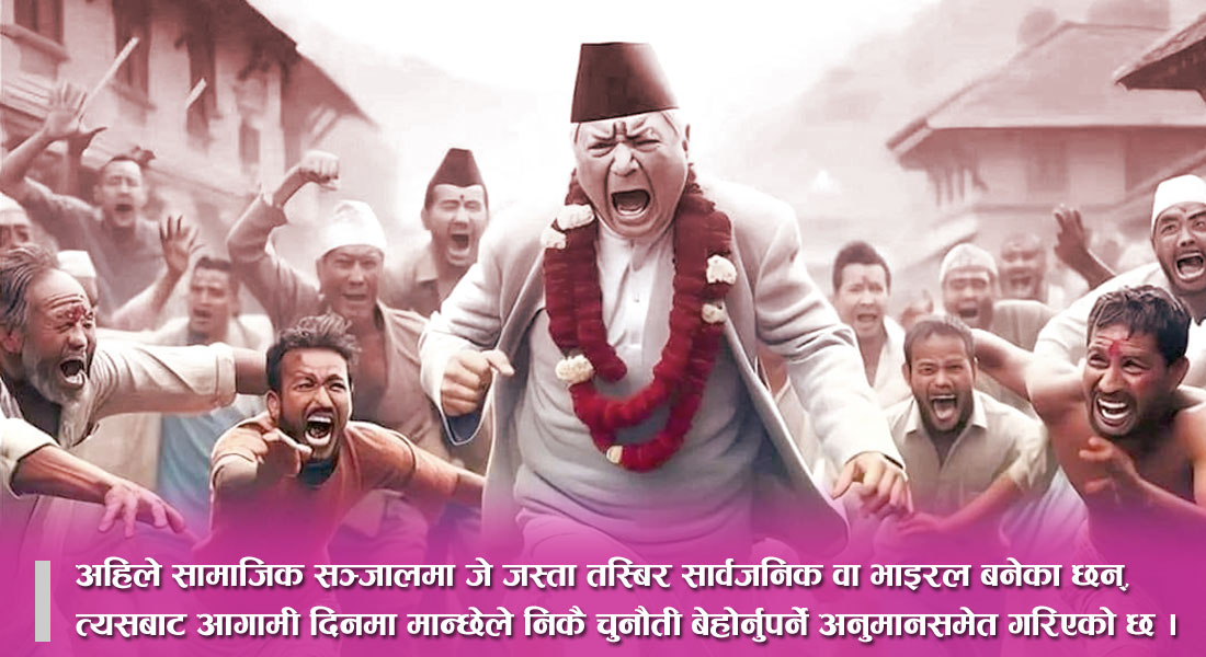 दुई दिनअघि सामाजिक सञ्जालमा एउटा एआईबाट तयार पारिएको तस्बिर भाइरल बनिरहेको छ । जसमा माला लगाएका एक नेतालाई जनताले समात समात भन्दै ‘मिसन ०८४ को हालत’ क्याप्सन दिइएको छ । आफूलाई मन नपर्ने दल र तिनका नेता वा सांसद मन्त्रीलाई यसरी नै तस्बिर बनाएर सामाजिक सञ्जालमा हालिदिने हो भने त्यो नेताको जमानतसमेत जफत हुने देखिन्छ । किनभने सामाजिक सञ्जाल भनेको भीड मन पराउने र गरीखान नदिने जमातले टाइम बिताउने थलो हो ।