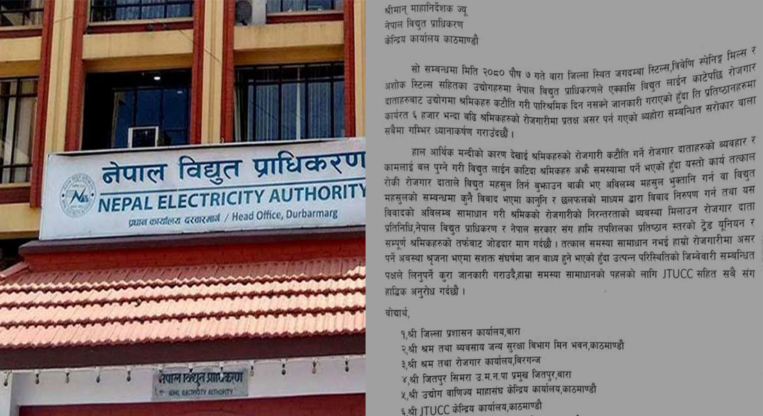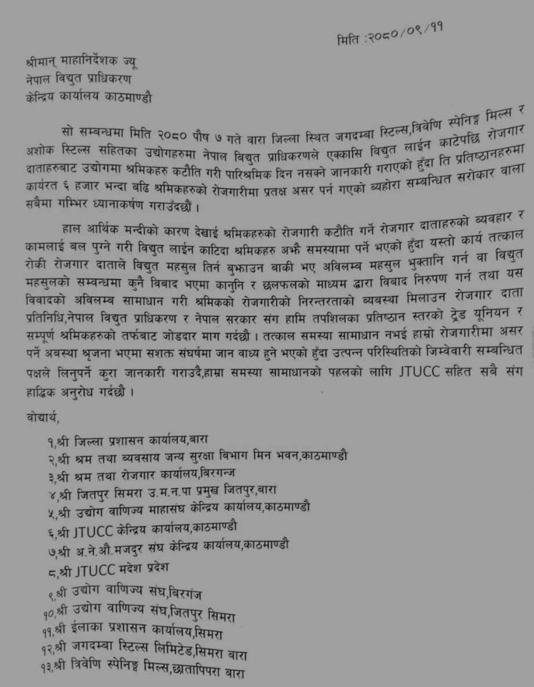 इलाका प्रशासन कार्यालय सिमराका प्रमुख ध्रुव गिरीमार्फत् नेपाल विद्युत प्राधिकरणलाई ध्यानाकर्षण पत्र बुझाइएको छ। नेपाल विद्युत प्राधिकरणले एक्कासी विद्युत लाइन काटेपछि रोजगार दाताहरुबाट उद्योगमा श्रमिकहरु कटौती गरी पारिश्रमिक दिन नसक्ने जानकारी गराएको हुँदा ती प्रतिष्ठानहरुमा कार्यरत ६ हजारभन्दा बढी श्रमिकहरुको रोजगारीमा प्रत्यक्ष असर पर्न गएको व्यहोरा सम्बन्धित सरोकारवाला सबैमा गम्भीर ध्यानाकर्षण गराउँदछौं , पत्रमा उल्लेख छ ।