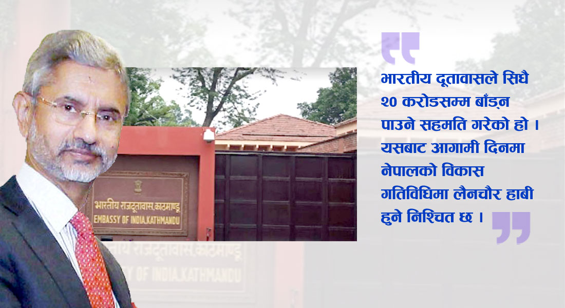 काठमाडौं । विकास परियोजनामा भारतीय दूतावासले सीधै २० करोड रुपैयाँसम्म बाँड्न पाउने गरी नेपालले सम्झौता गरेको छ । हाल पाँच करोडसम्म सहयोग गर्न पाउने व्यवस्था छ । भारतीय विदेशमन्त्री एस जयशंकरको भ्रमणका क्रममा नेपालले विकास परियोजनामा भारतीय दूतावासले सिधै २० करोडसम्म बाँड्न पाउने सहमति गरेको हो । यसबाट आगामी दिनमा नेपालको विकास गतिविधिमा लैनचौर हाबी हुने निश्चित छ ।