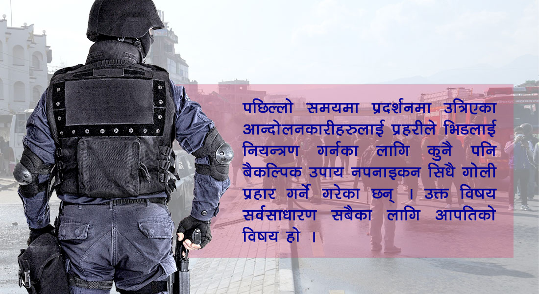सुरक्षामा खटिएका प्रहरीले कुनै पनि आन्दोलन नियन्त्रण लिन पानीको फोहोरा, अश्रुग्याँस, हवाई फायर, लाठ्ठी चार्ज, पक्राउ गरेर नियन्त्रण, रबरको गोलीको प्रयोग, गोली नै चलाउनुपर्ने अवस्था सिर्जना भए घुँडामुनि हान्ने नियममा उल्लेख छ । त्यो सबै तालिम प्रहरी अधिकृतहरूले सिपाईलाई तथा अन्य दर्जाका कर्मचारीहरूलाई दिइएको हुन्छ । तर पछिल्लो समयमा प्रदर्शनमा उत्रिएका आन्दोलनकारीलाई प्रहरीले भिडलाई नियन्त्रण गर्न कुनै पनि वैकल्पिक उपाय नपनाईकन सिधै गोली प्रहार गर्ने गरेका छन् ।