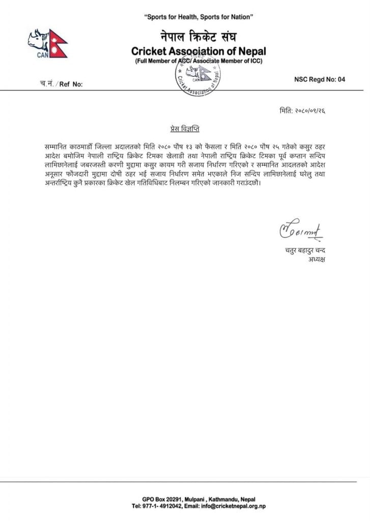 ‘सम्मानित काठमाडौँ जिल्ला अदालतको मिति २०८० पुस १३ को फैसला र मिति २०८० पुस २५ गतेको कसुर ठहर आदेशबमोजिम नेपाली राष्ट्रिय क्रिकेट टिमका खेलाडी तथा नेपाली राष्ट्रिय क्रिकेट टिमका पूर्व कप्तान सन्दीप लामिछानेलाई जबर्जस्ती करणी मुद्दामा कसुर कायम गरी सजाय निर्धारण गरिएको र सम्मानित अदालतको आदेशअनुसार फौजदारी मुद्दामा दोषी ठहर भई सजाय निर्धारण समेत भएकाले निज सन्दीप लामिछानेलाई घरेलु तथा अन्तर्राष्ट्रिय कुनै प्रकारका क्रिकेट खेल गतिविधिबाट निलम्बन गरिएको जानकारी गराउँदछौं,’ क्यानले बिहीबा जारी गरेको विज्ञप्तिमा उल्लेख छ ।