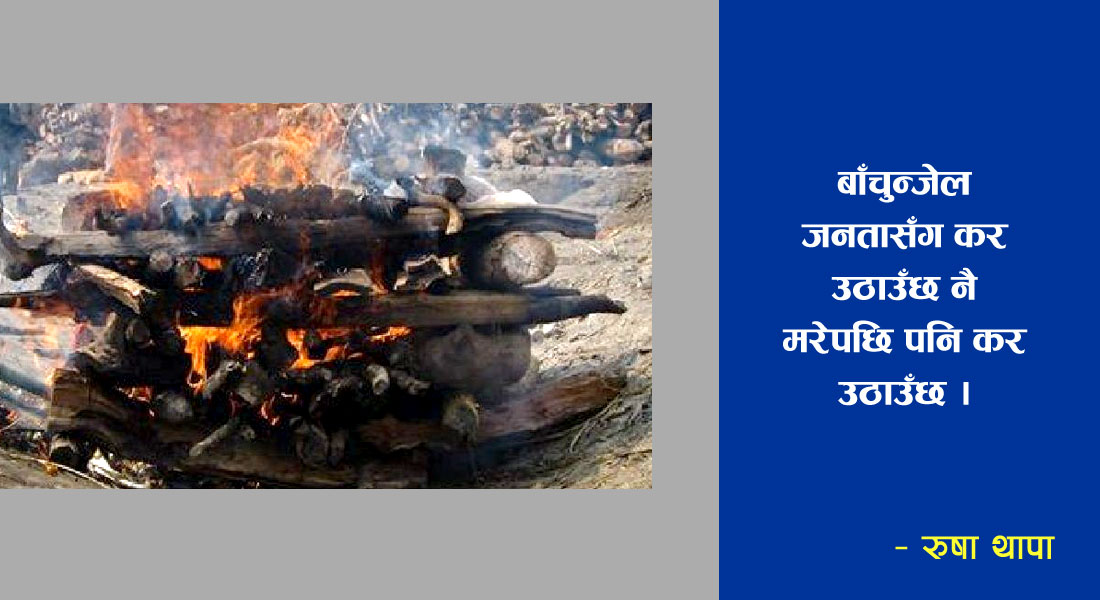 जो व्यक्तिले बाँचुन्जेल राज्यलाई कर तिर्यो, राजनीतिक दललाई भोट हाल्यो, आफ्नै देशमा रोजगारी गरेर परिवार पाल्नुका साथै देश विकासमा योगदान पुर्यायो, त्यस्ता व्यक्तिलाई सरकारले मरेपछि पनि करबिना लास जलाउन दिँदैन ।