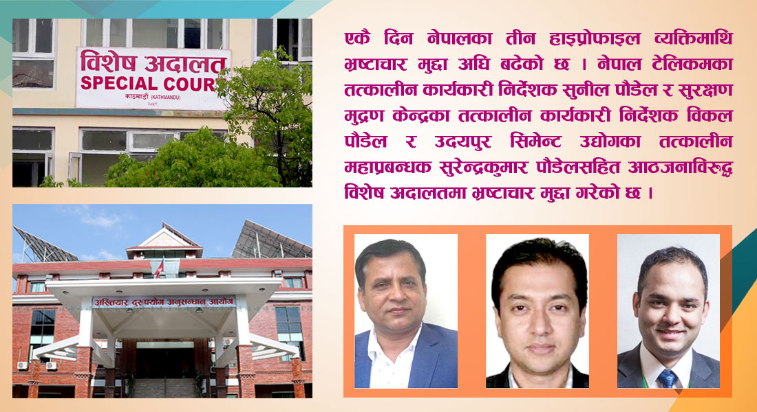 काठमाडौं । एकै दिन नेपालका तीन हाइप्रोफाइल व्यक्तिमाथि भ्रष्टाचार मुद्दा अघि बढेको छ । नेपाल टेलिकमका तत्कालीन कार्यकारी निर्देशक सुनील पौडेल र सुरक्षण मुद्रण केन्द्रका तत्कालीन कार्यकारी निर्देशक विकल पौडेललाई बुधबार अख्तियार दुरुपयोग अनुसन्धान आयोगले नियन्त्रणमा लिएको छ ।
