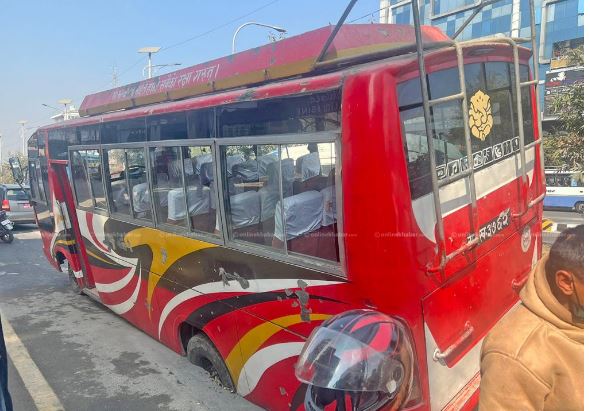 काठमाडौं । काठमाडौंको नयाँबानेश्वर चोकको सडकमा गुडिरहेको बस भासिएको छ । बा ३ ख ३७६२ नम्बरको बस गुडिरहेको बेला भासिएको हो । उक्त बस शुक्रबार रत्नपार्कतर्फ जाँदै थियो ।