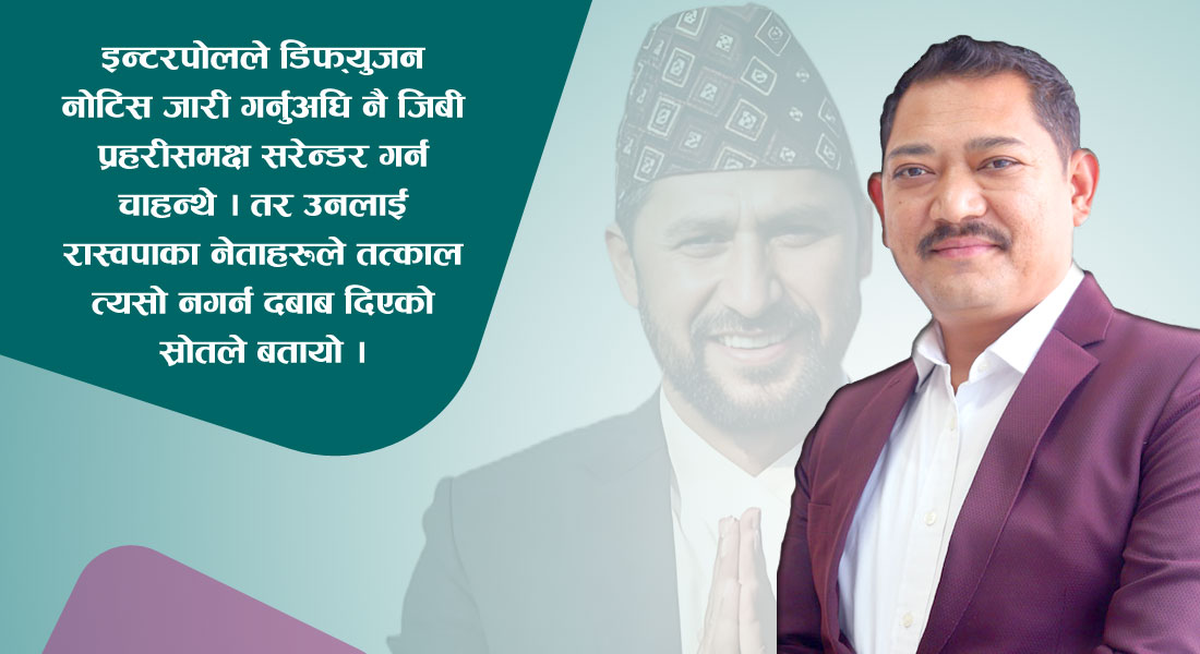 इन्टरपोलले डिफ्युजन नोटिस जारी गर्नुअघि नै जिबी प्रहरीसमक्ष सरेन्डर गर्न चाहन्थे । तर उनलाई रास्वपाका नेताहरूले तत्काल त्यसो नगर्न दबाब दिएको स्रोतले बतायो ।