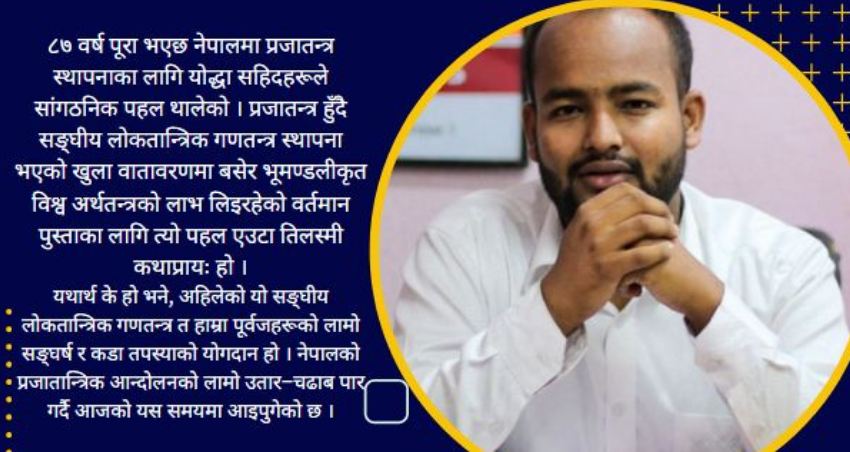 ८७ वर्ष पूरा भएछ नेपालमा प्रजातन्त्र स्थापनाका लागि योद्धा सहिदहरूले सांगठनिक पहल थालेको । प्रजातन्त्र हुँदै सङ्घीय लोकतान्त्रिक गणतन्त्र स्थापना भएको खुला वातावरणमा बसेर भूमण्डलीकृत विश्व अर्थतन्त्रको लाभ लिइरहेको वर्तमान पुस्ताका लागि त्यो पहल एउटा तिलस्मी कथाप्रायः हो ।