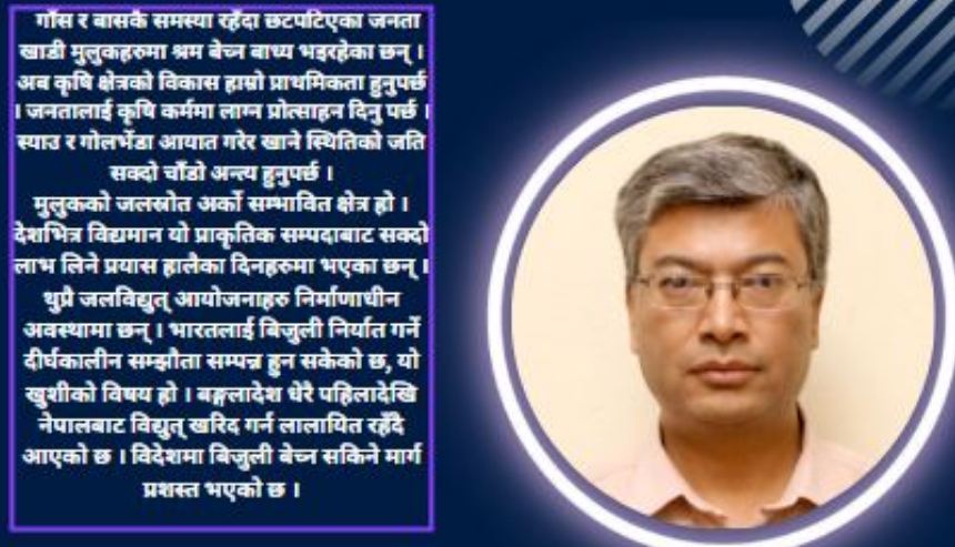 गाँस र बासकै समस्या रहँदा छटपटिएका जनता खाडी मुलुकहरुमा श्रम बेच्न बाध्य भइरहेका छन् । अब कृषि क्षेत्रको विकास हाम्रो प्राथमिकता हुनुपर्छ । जनतालाई कृषि कर्ममा लाग्न प्रोत्साहन दिनु पर्छ । स्याउ र गोलभेंडा आयात गरेर खाने स्थितिको जति सक्दो चाँडो अन्त्य हुनुपर्छ ।