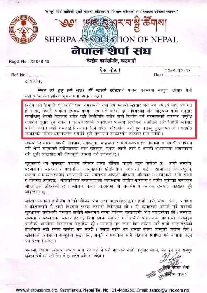 गतवर्ष संघकै अनुरोधमा पञ्चाङ्ग निर्णायक समितिले सही तिथिमै ल्हासार पारेको थियो। त्यही क्रमलाई निरन्तरता दिने अपेक्षा गरिएपनि त्यसो हुन नसक्नु दुःखद पक्ष हो । यसप्रति सरकारको गम्भिर ध्यानाकर्षण गराउदै त्रुटी सच्याउन सरकारसँग जोडदार माग गर्दछौ ,जारी विज्ञप्तीमा उल्लेख छ । ग्याल्पो ल्होसारमा आपसी सद्भाव, सहिष्णुता, भाइचारा र मेलमिलापसहित हिमाली जादिवासी र विशेष गरी शेषा समुदायले हर्षोल्लासका साथ छडरपुल, गुथुक खाप्से खाने र आपसी शुभकामना आदनप्रदान गरी खुसी साटासाट गर्दै दीर्घायुको कामना गर्ने प्रचलन छ । चाडपर्व र अन्य प्रकारका सार्वजनिक, उत्सव र उर्दीको व्यवस्थापन गृह मन्त्रालयले गर्छ। नेपाल सरकार कार्यविभाजन नियमावली, २०७४ मा यो कुरा उल्लेख छ। गृह मन्त्रालयले वर्षभरि दिइने बिदाको सूची नै राजपत्रमा प्रकाशित गरी सार्वजनिक जानकारी दिन्छ। आउँदो २०८१ वैशाख १ देखि चैत मसान्तसम्मका लागि गत माघ २९ गते नै बिदा तय गरी सूचना प्रकाशित गरिसकिएको छ।