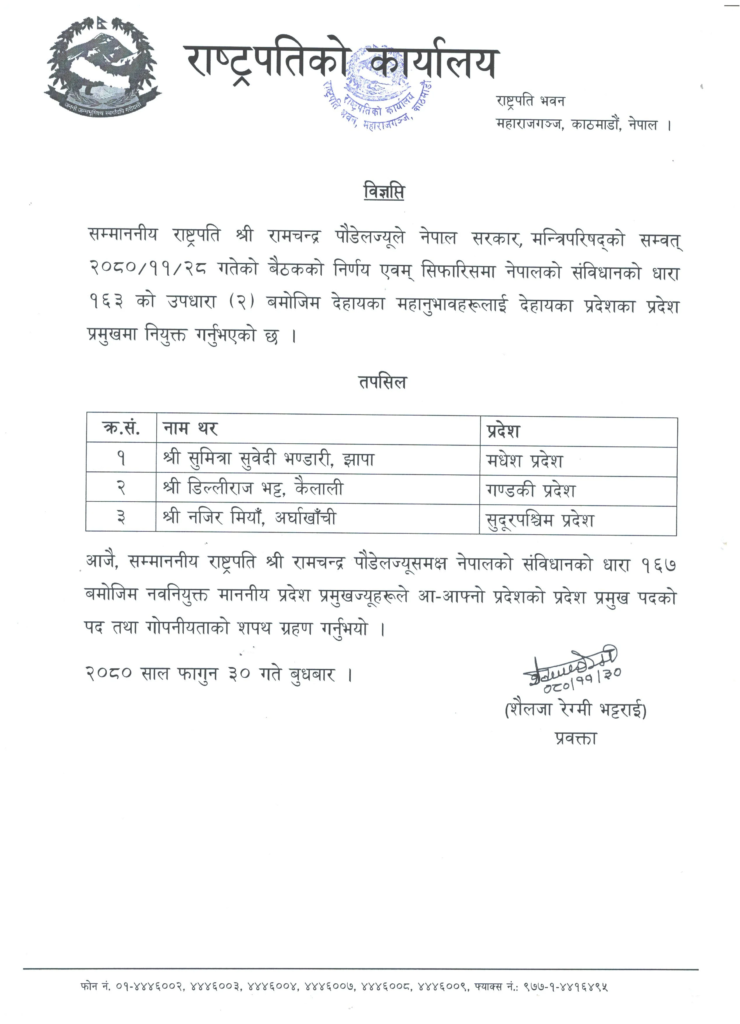 मधेसका लागि सुमित्रा भण्डारी, गण्डकीका लागि डिल्लीराज भट्ट र सुदूरपश्चिम प्रदेशका लागि नजिर मियाँले शपथ लिएका छन् । सरकारको सिफारिसमा राष्ट्रपति पौडेलले उनीहरुलाई प्रदेश प्रमुखमा नियुक्त गरेका थिए ।