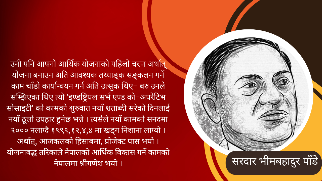 नेपालको आर्थिक विकास यथाशक्य चाँडो गर्नलाई के–के गर्नपर्दछ, त्यसको तुरुन्त रूपरेखा तयार गर्नू भन्ने श्री ३ जुद्धशम्शेरबाट १९९९ साल मार्गमा मे.ज. विजयशम्शेरलाई अनौपचारिक निर्देशन भयो– विकास सम्बन्धी काम हुन लागेको सुइँको पाए ती वरिष्ठ रोलवाला राणाहरूले बीचबीचै भाँजी मारी दिने हुँदा । अनि मे.ज. विजयशम्शेर र प्रो. भीमबहादुर पाँडे जो १९९८ सालमा कलकत्ता विश्वविद्यालयबाट एम् ए, एम् कम् पास र मैसूर रियासतमा इण्डष्ट्रियल स्ट्रक्चर एण्ड इट्स डिभ्लपमेण्ट विषयमा तालीम प्राप्त गरी १९९९ साल भाद्रको शुरुमा नेपाल फर्केका थिए । यीनै दुई जनाले १९९९ साल पौषदेखि नेपालको भावी आर्थिक विकासको रूपरेखा कोर्न थाले । योजनाबद्ध तरिकाले नेपालको आर्थिक विकास गर्ने कल्पना भएको नेपालको इतिहासमा यो हो सबैभन्दा पहिलो बाजि । त्यसअघि एकाध पटके विकासले आर्थिक विकासका काम हुन्थे ।