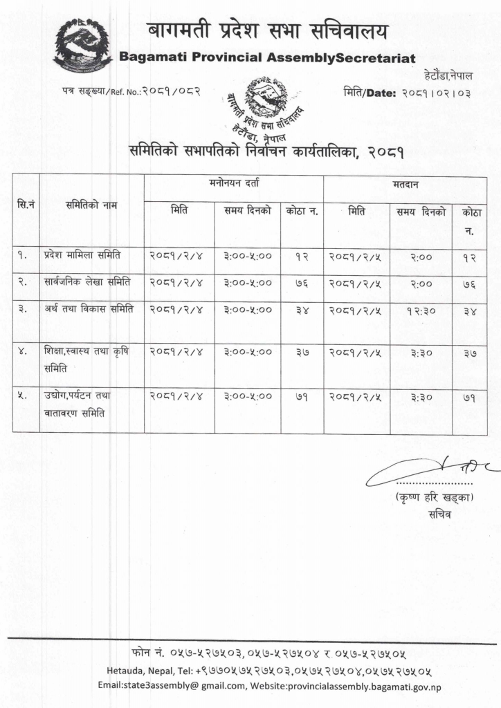 प्रदेशसभा नियमावली (पहिलो संशोधन) २०७४ को अनुसूची- ३ बमोजिम समितिका कुनै सदस्यलाई सभापतिमा निर्वाचित गरियोस् भनी सम्बन्धित समिति कै अर्का सदस्यको समर्थनमा मनोनयन प्रस्ताव दर्ता गराउने प्रवक्ता मनोज कुमार गुप्ताले जानकारी दिए ।
