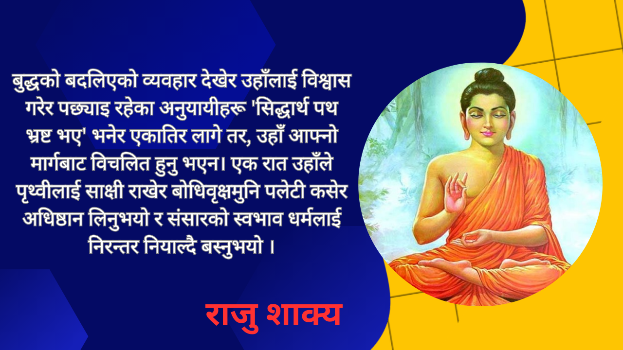 गुरुहरूको दैलो चहार्दै त्यसबेलाका परम्परा र वादहरू सिक्दै पछ्याउँदै जानुभयो, उहाँलाई त्यसबाट सन्तुष्टि मिलेन, ती पूर्ण महसुस भएनन् । एक्लै अघि बढ्ने प्रयासमा उहाँ आहार त्यागेर कठोर तपस्यामा लीन हुनुभयो । शरीर दुर्बल र क्षीण भयो तर, ज्ञानोदय भएन । फेरि भोजन ग्रहण गर्न थाल्नुभयो । उहाँको बदलिएको व्यवहार देखेर उहाँलाई विश्वास गरेर पछ्याइरहेका अनुयायीहरू ‘सिद्धार्थ पथभ्रष्ट भए’ भनेर एकातिर लागे तर, उहाँ आफ्नो मार्गबाट विचलित हुनुभएन । एक रात उहाँले पृथ्वीलाई साक्षी राखेर बोधिवृक्षमुनि पलेटी कसेर अधिष्ठान लिनुभयो र संसारको स्वभाव धर्मलाई निरन्तर नियाल्दै बस्नुभयो ।