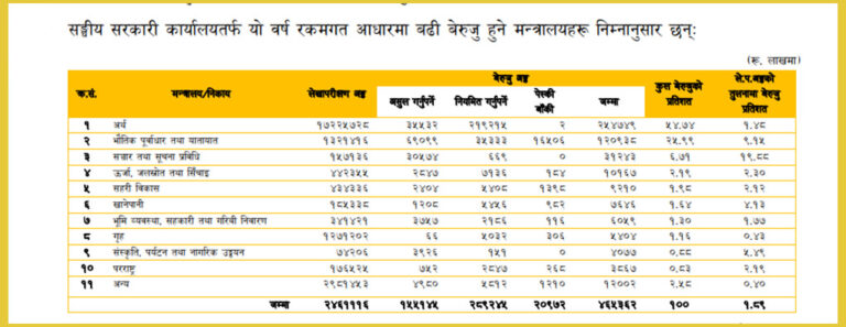 प्रतिवेदनमा भौतिक तथा पुर्वधार यातायात मन्त्रालयको बेरुजु २५.९९ , सञ्चार तथा सूचना प्रविधि मन्त्रालयको बेरुजु ६.७१ प्रतिशत, उर्जा, जलस्रोत तथा सिचाई मन्त्रालयको २.१९ प्रतिशत, शहरी विकास मन्त्रालय १.९८, खानेपानी मन्त्रालय १.६४ प्रतिशत, भूमि व्यवस्थापन, सहकारी तथा गरिबी निवारण मन्त्राल १.३० प्रतिशत, गृह मन्त्रालयको १.१६ प्रतिशत, संस्कृति, पयर्टन तथा नागरिक उड्डयन मन्त्रालय ०.८८ प्रतिशत, परराष्ट्र मन्त्रालय ०.८३ प्रतिशत र अन्य मन्त्रालयहरुको २.५८ प्रतिशत बेरुजु रकम देखिएको उल्लेख छ ।
