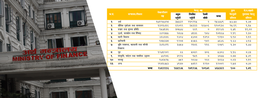 आइतबार महालेखा परीक्षकको कार्यालयले सार्वजनिक गरेको ६१औं वार्षिक प्रतिवेदनमा नेपाल सरकारका मन्त्रालयहरुमध्ये सबैभन्दा बढी अर्थ मन्त्रालयको ५४.७४ बेरुजु रहेको देखाएको हो ।