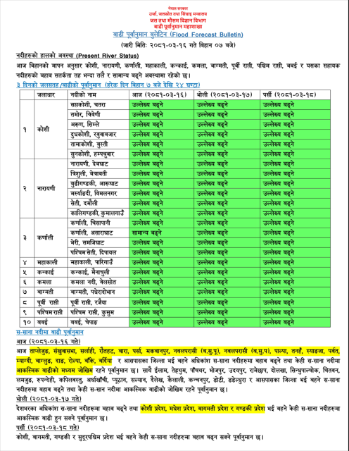 महाशाखाले आज (आइतबार) बिहान सूचना निकालेर आउँदो तीन दिन कोशी, नारायणी, कर्णाली र यसका सहायक नदीमा तथा बाग्मती, कमला, पूर्वी राप्ती, पश्चिम राप्ती र बबईको जलसतह उल्लेख्य रूपमा बढ्ने भन्दै नदी तटीय क्षेत्रका क्रियाकलापमा उच्च सतर्कता अपनाउन अनुरोध छ ।