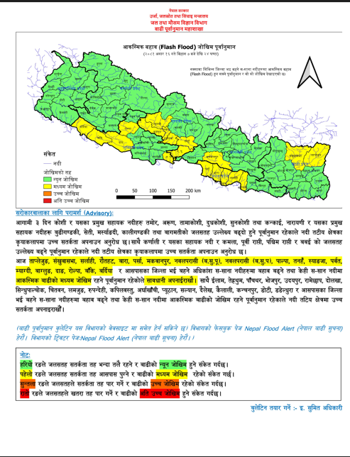 आज ताप्लेजुङ, सङ्खुवासभा, सर्लाही, रौतहट, बारा, पर्सा, मकवानपुर, नवलपरासी, तनहुँ, स्याङ्जा, पर्वत, म्याग्दी, बाग्लुङ, रोल्पा, दाङ, बाँके र बर्दियालगायत ३९ जिल्ला आसपासका जिल्लाका सबैजसो सानाठूला नदीमा पानीको सतह बढ्ने महाशाखाको सूचनामा उल्लेख छ । यी जिल्लामा आज मध्ययम खालको जोखिम रहे पनि कतिपय नदीमा आकस्मिक रूपमा ठूलो बाढी आउ सक्ने भन्दै महाशाखाले उच्च सतर्कता आवश्यक रहेको बताएको छ ।