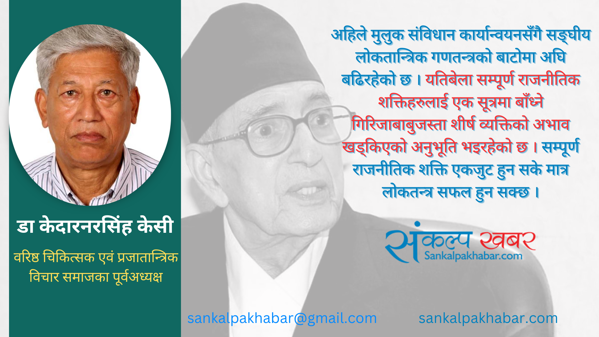 छ दशकभन्दा लामो संविधानसभा निर्वाचन गर्ने कांग्रेसका संस्थापक नेता बिपी कोइरालाको सपना पूरा भएको थियो । चारपटक मुलुकको प्रधानमन्त्री बनेका नेता कोइरालाले अन्तिम कार्यकालमा भने कार्यवाहक राष्ट्राध्यक्षको कार्यभारसमेत सम्हाल्नुभएको थियो । संवाद, सहमति र सहकार्यको माध्यमबाट राजनीतिक स्थायित्व कायम गरी राष्ट्रिय एकता, लोकतन्त्र र समृद्धिको दिशामा दृढतापूर्वक अघि बढ्नुपर्छ भन्ने उहाँको मान्यता अहिले पनि सबैको मार्गदर्शक बनेको छ । उहाँले आफ्नो जीवनकालभरि कालो झन्डा र विरोधको सामना गर्नु परे पनि मृत्युपर्यन्त उहाँले जति प्रशंसा र सम्मान प्राप्त गर्ने अवसर सायदै अरू व्यक्तिलाई प्राप्त भयो होला । आफूले हारे पनि मुलुकले जित्नुपर्छ भन्ने दर्शनबाट प्रेरित उहाँ आफ्नो विरोध गर्ने र कालो झन्डा देखाउने प्रवृत्तिलाई आफैँले लडेर प्राप्त गरेको प्रजातन्त्रको उपलब्धिका रूपमा लिनुहुन्थ्यो । राजतन्त्रविरुद्ध दलहरुले संयुक्त रूपमा लडेर संविधानसभाबाट संविधान बनाउने कार्य कोइरालाको योगदानबाट सम्भव भएको थियो ।
