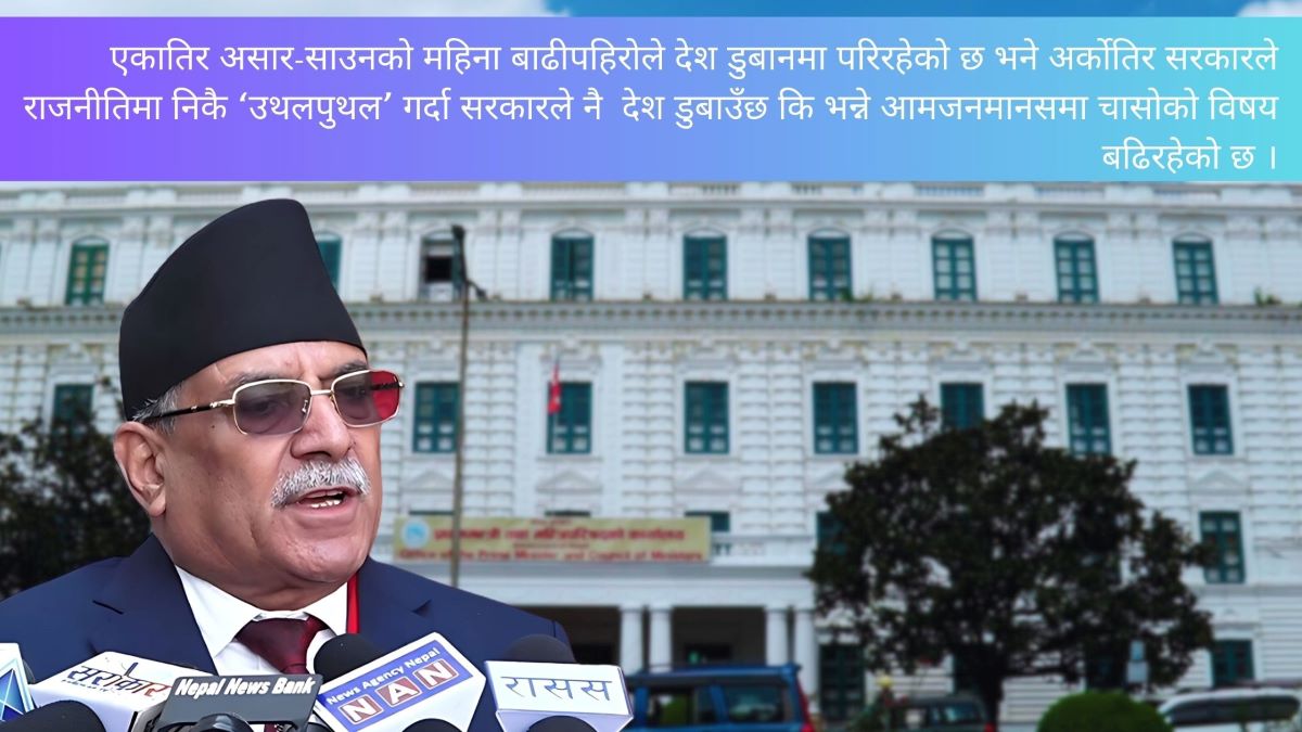 काठमाडौं । प्रधानमन्त्री पुष्पकमल दाहाल प्रचण्ड कै भाषा सापटी लिएर भन्ने हो भने २०७९–८० र ०८१ सालको नेपाली राजनीतिमा निकै ‘उथलपुथल’ भएको देखिन्छ । ०८० मा त कति हो कति यो ‘उथलपुथल’ २०८१ मा पनि जारी नै रहेको छ । राजनीतिक अस्थिरताले सत्ता समीकरण फेरबदल भयो भने यसको असर प्रदेशसम्म नै परिरहेको छ । एकातिर असार–साउनको महिना बाढीपहिरोले देश डुबानमा परिरहेको छ भने अर्कोतिर सरकारले राजनीतिमा निकै ‘उथलपुथल’ गर्दा सरकारले नै देश डुबाउँछ कि भन्ने आमजनमानसमा चासोको विषय बढिरहेको छ ।
