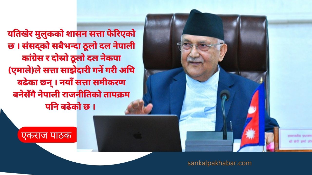 यतिखेर मुलुकको शासन सत्ता फेरिएको छ । संसद्को सबैभन्दा ठूलो दल नेपाली कांग्रेस र दोस्रो ठूलो दल नेकपा (एमाले)ले सत्ता साझेदारी गर्ने गरी अघि बढेका छन् । नयाँ सत्ता समीकरण बनेसँगै नेपाली राजनीतिको तापक्रम पनि बढेको छ । सहमतिअनुरूप एमालेका अध्यक्ष केपी शर्मा ओलीले पहिलो र नेपाली कांग्रेसका सभापति शेरबहादुर देउवाले दोस्रो कार्यकालको नेतृत्व गर्नुहुने सहमति भएको छ । सोहीबमोजिम नै आइतबार केपी ओली प्रधानमन्त्रीमा नियुक्त हुनुभएको छ भने उहाँको सरकारमा नेपाली कांग्रेस पनि सक्रिय रुपमा सहभागी छ ।