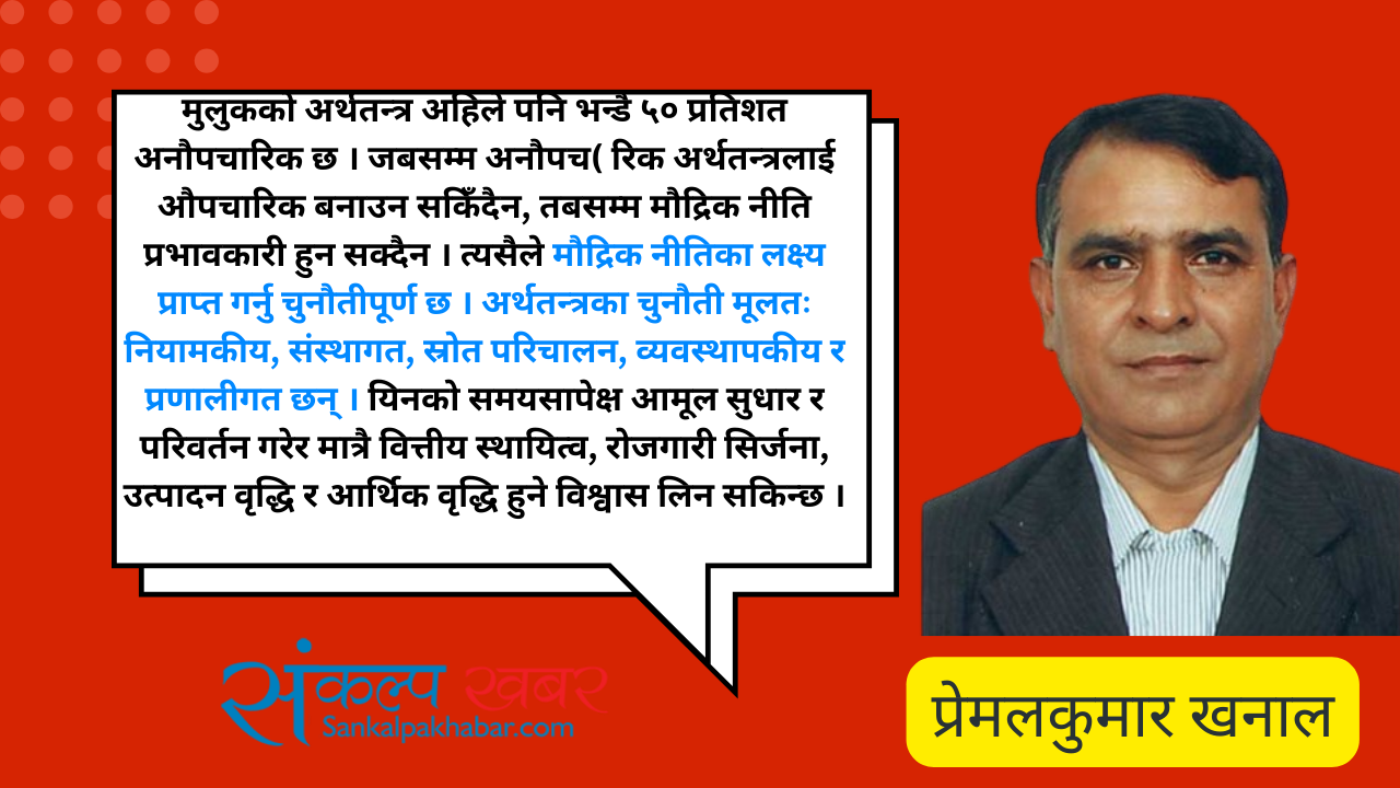 मुलुकको अर्थतन्त्र अहिले पनि झन्डै ५० प्रतिशत अनौपचारिक छ । जबसम्म अनौपचारिक अर्थतन्त्रलाई औपचारिक बनाउन सकिँदैन, तबसम्म मौद्रिक नीति प्रभावकारी हुन सक्दैन । त्यसैले मौद्रिक नीतिका लक्ष्य प्राप्त गर्नु चुनौतीपूर्ण छ । अर्थतन्त्रका चुनौती मूलतः नियामकीय, संस्थागत, स्रोत परिचालन, व्यवस्थापकीय र प्रणालीगत छन् । यिनको समयसापेक्ष आमूल सुधार र परिवर्तन गरेर मात्रै वित्तीय स्थायित्व, रोजगारी सिर्जना, उत्पादन वृद्धि र आर्थिक वृद्धि हुने विश्वास लिन सकिन्छ ।