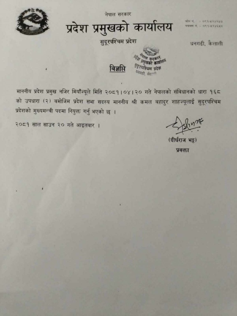 काठमाडौं । सुदूरपश्चिम प्रदेशको मुख्यमन्त्रीमा नेपाली कांग्रेस संसदीय दलका नेता कमलबहादुर शाह पुनः नियुक्त भएका छन् । आइतबार बिहान नेकपा एमालेको समर्थनमा दाबी पेस गरेका शाहलाई प्रदेश प्रमुख नजिर मियाँले मुख्यमन्त्री नियुक्त गरेका हुन् । राजनीतिक समिकरण परिर्तन भएपछि शाह दोस्रोपटक सुदूरपश्चिमको मुख्यमन्त्रीमा नियुक्त भएका हुन् ।