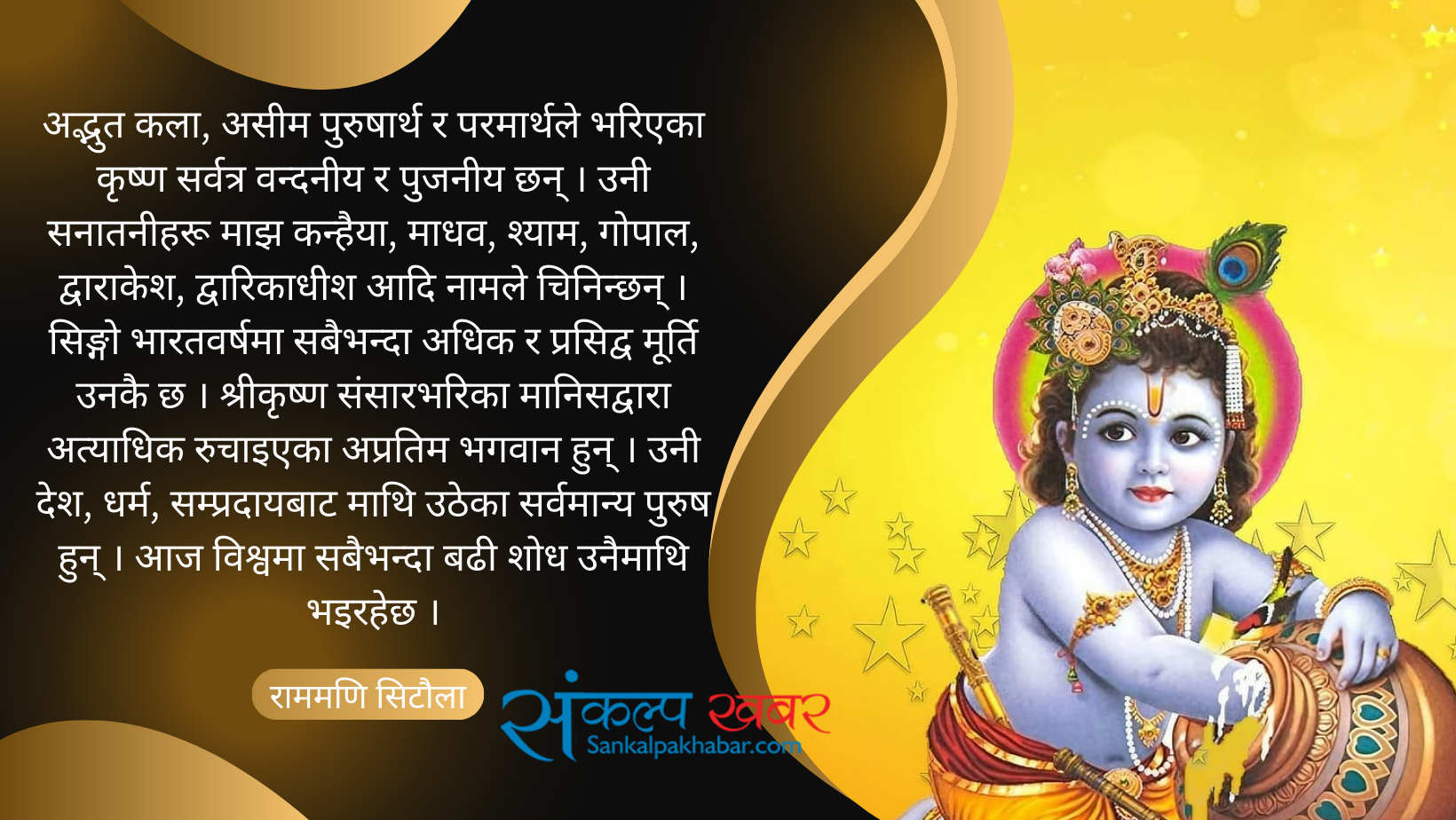 श्रीमद्भागवतमा उनको विराट् स्वरूपको पनि चर्चा आउँछ । उनले आफ्नो त्यो स्वरूप अक्रूर, उद्वव, राजा मुचुकुन्द, शिशुपाल, धृतराष्ट्रको सभामा देखाएका थिए । अद्भुत कला, अविश्वसनीय चमत्कारले भरिएका कृष्ण सनातन धर्मका आधारतम्भ र अप्रतिम भगवान हुन् । कृष्णाष्टमीका अवसरमा कृष्णप्रति शतशत नमन–