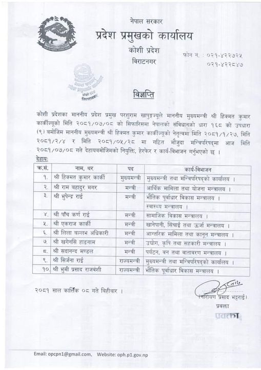 काठमाडौं । कोशीका मुख्यमन्त्री हिक्मतकुमार कार्कीले भौतिक तथा पूर्वाधारमन्त्री भूपेन्द्र राईलाई स्वास्थ्यमन्त्रालयको जिम्मेवारी पनि दिएका छ्न । मुख्यमन्त्री कार्कीले बिहीबार राईलाई स्वास्थ्य मन्त्रालयको जिम्मेवारी दिएका हुन् ।