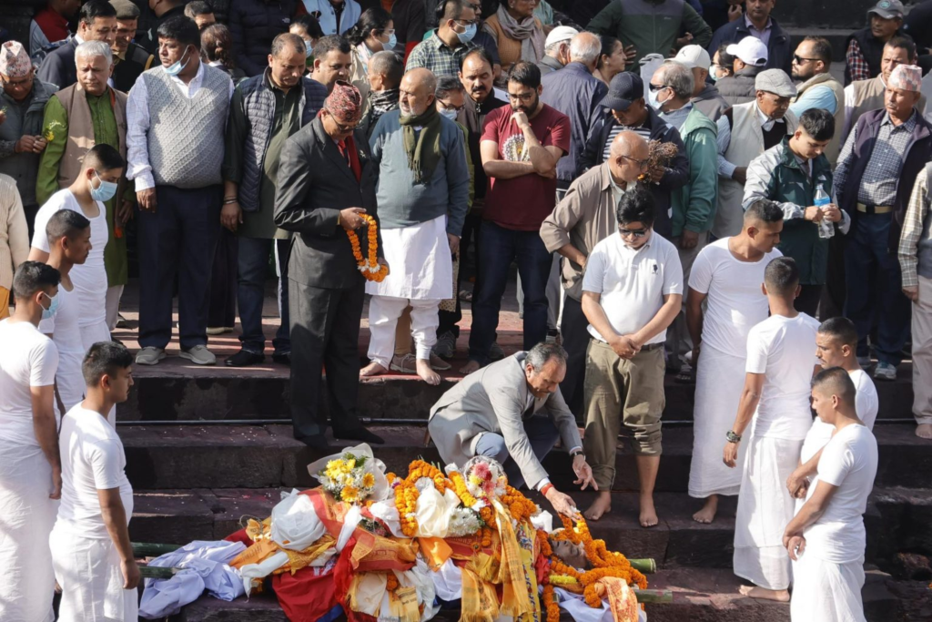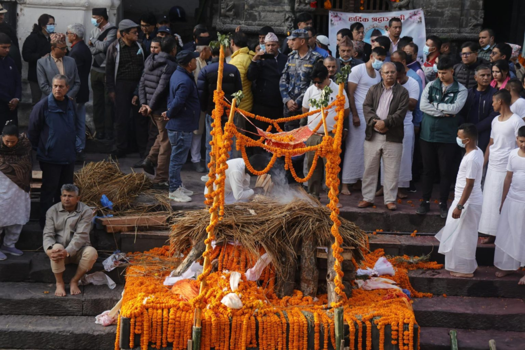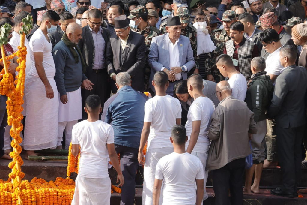 काठमाडौं । पूर्वसभामुख दमननाथ ढुंगानाको पशुपति आर्यघाटमा अन्त्येष्टि गरिएको छ । आइतबार दिवंगत ढुंगानाको आज राजकीय सम्मानका साथ अन्त्येष्टि गरिएको हो । स्वर्गीय ढुंगानालाई उनका छोराहरु निमेष र निशेषले दागबत्ती दिएका छन् । सो क्रममा नेपाली सेनाको टोलीले सलामी अर्पण गर्नुका साथै शोक धुन बजाएको थियो । अन्त्यष्टी समारोहमा सर्व साधारणदेखी विशिष्ट व्यक्तिहरुको बाक्लो भिड लागेको छ ।