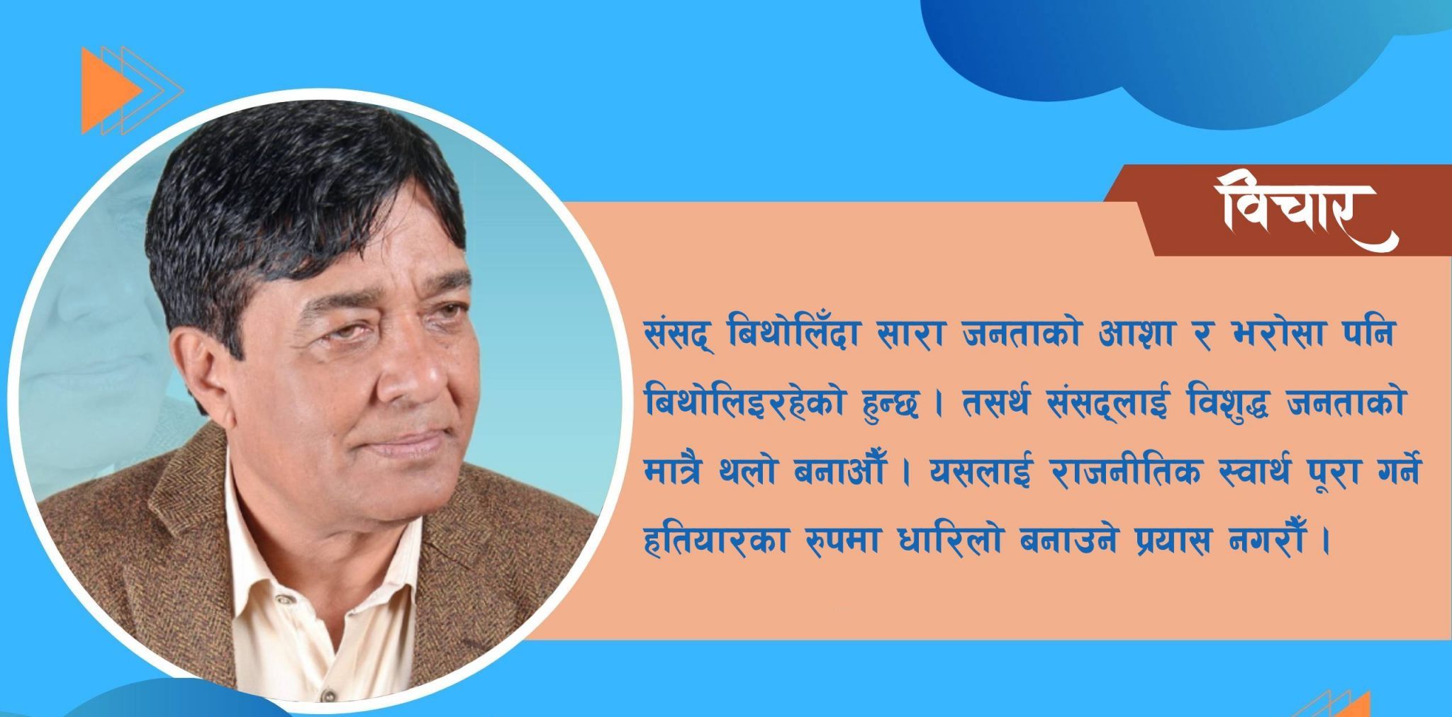 यसरी जनताले आफैँ प्रत्यक्ष नभए पनि आफ्ना प्रतिनिधिमार्फत नीतिगत तहमै आफ्नो प्रतिनिधित्व महसुस गरेका हुन्छन् तर यसरी चुनिएर आएका प्रतिनिधहरूले नै जनतालाई महसुस हुने गरी काम नगर्दा आमनागरिकमा संसद्प्रति नै भरोसा रहँदैन । यसथ संसद् भनेको लोकतन्त्र निखार्ने एउटा प्रतिनिधिमूलक थलो पनि हो, जहाँ बसेर जनप्रतिनिधिहरूले सरकारलाई खबरदारी गर्न सक्छन् । जनताको जीवनसँग गाँसिने र उनीहरूलाई महसुस हुनेगरी ऐन, कानुन बनाउन सक्छन् । हाम्रा सांसदहरूले भने विस्तारै लोकतन्त्रको यो उच्चतम परिभाषा बोकेको संसद्को मान्यतालाई नै बिथोल्न थालेका छन् । त्यसैले ‘भोट हाल्नका लागि हाल्दिएको’ भनेर नागरिकले पनि वास्ता गर्दैनन् । जनता र जनप्रतिनिधिबीच नजिकको सम्बन्ध हुनुपर्नेमा टाढा हुन जाँदा संसद्ले जनविश्वास गुमाउँदै गएको त छैन भन्ने प्रश्न उठ्न दिनु हुँदैन ।