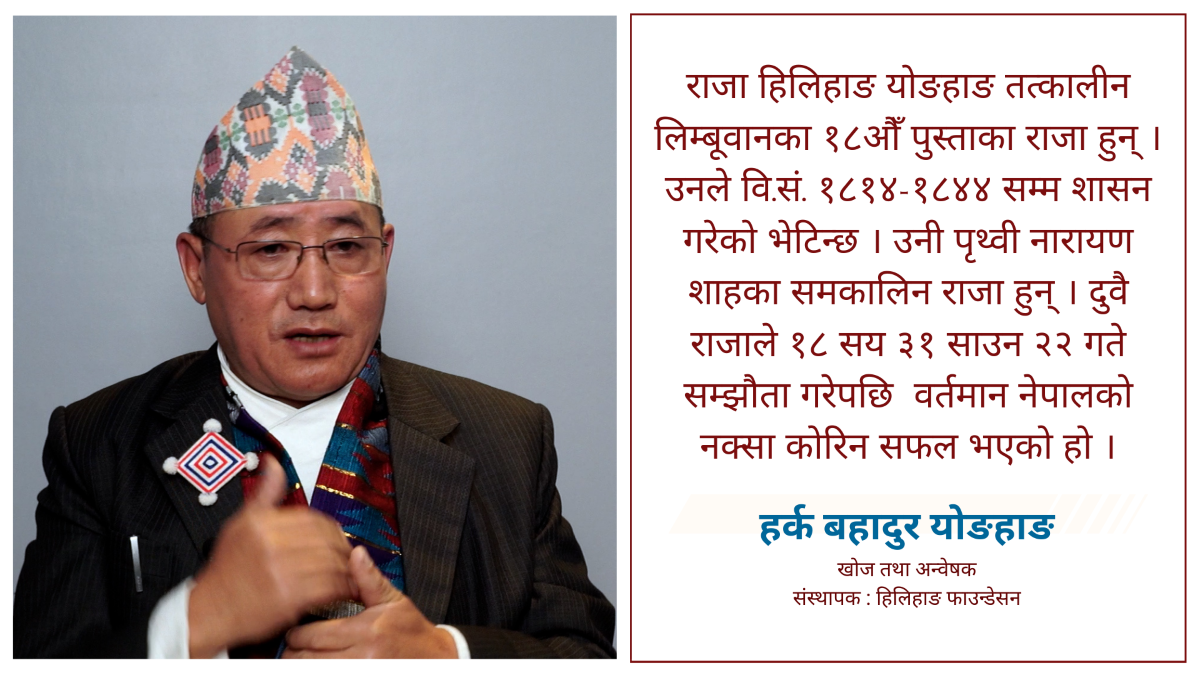 – एकदम सत्य हो । अहिले पनि नेपाली सेनाको झण्डा जस्तै लिम्बूहाङले प्रयोग गर्ने गरेको पाइन्छ । सम्झौतापछि चाहिँ डबल बनाएको पाइन्छ । त्यो झण्डाहरु अहिले नेपाली सेनासँग देख्न सकिन्छ । त्यस कारण त्यसबेला लिम्बूहरु बलिया थिए भन्ने प्रमाण हो ।
