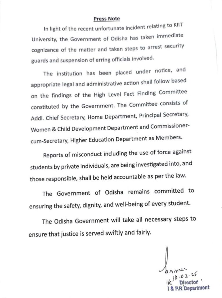 ओडिसा राज्य सरकारले जारी गरेको विज्ञप्तिमा भनिएको छ- ‘सरकारले गठन गरेको उच्चस्तरीय तथ्य खोजी समितिको निष्कर्षको आधारमा उपयुक्त कानुनी र प्रशासनिक कारबाही गरिनेछ । समितिले विद्यार्थीमाथि गरिएको दुर्व्यबहारको समेत अध्ययन गर्ने र सो मा संलग्नलाई कारवाहीको दायरमा ल्याउने छ ।’विज्ञप्तिमा ओडिशा सरकार विद्यार्थीको सुरक्षा, आत्मसम्मानप्रति प्रतिबद्ध रहेको उल्लेख छ ।किट विश्वविद्यालयले यसअघि मंगलबारनै दुई सुरक्षा गार्डहरूलाई बर्खास्त गरेको र अन्य तीन जनालाई निलम्बन गरेको जानकारी दिएको थियो ।