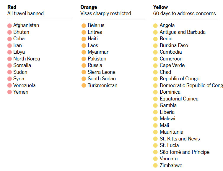भुटासहिन अमेरिका प्रवेश गर्नबाट पूर्ण रूपमा निषेध गरिएका देशमा अफगानिस्तान, क्युबा, इरान, लिबिया, उत्तर कोरिया, सोमालिया, सुडान, सिरिया, भेनेजुएला र यमन रहेका छन्।