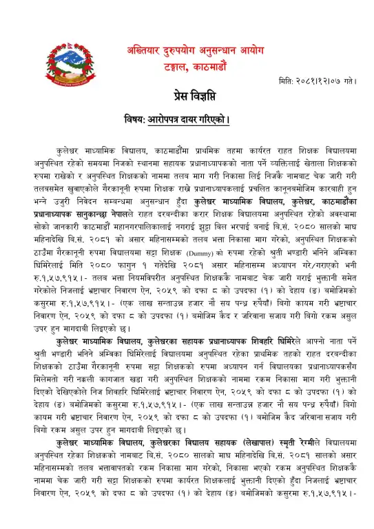 काठमाडौं । कुलेश्वर माध्यमिक विद्यालय, काठमाडौंका प्रधानाध्यापक सानुकान्छा (एसके) नेपालसहित चार जनाविरुद्ध अख्तियार दुरुपयोग अनुसन्धान आयोगले भ्रष्टाचार मुद्दा दायर गरेको छ। विद्यालयमा अनुपस्थित शिक्षकको नाममा तलबभत्ता निकासा गरी गैरकानुनी लाभ लिएको आरोपमा उनीहरुविरुद्ध विशेष अदालत काठमाडौंमा मुद्दा दायर गरिएको हो।