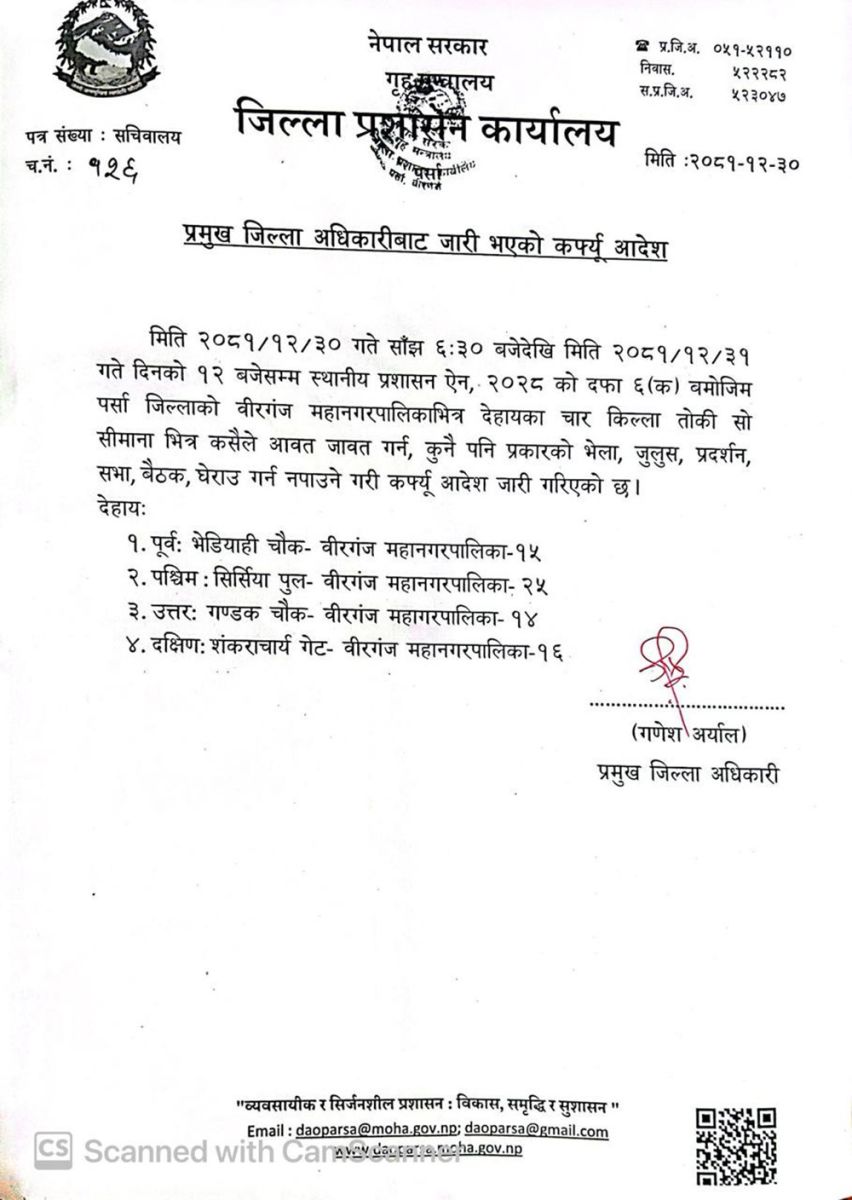 कार्यालयले स्थानीय प्रशासन ऐन, २०२८ को दफा ६ (क) बमोजिम जिल्लाको वीरगञ्ज महानगरपालिकाभित्र चार किल्ला तोकेर सिमानाभित्र कसैले आवतजावत गर्न, कुनै पनि प्रकारको भेला, जुलुस, प्रदर्शन, सभा, बैठक, घेराउ गर्न नपाउने गरी कर्फ्यू आदेश जारी गरेको छ । जसअनुसार पूर्वः भेडियाही चौक– वीरगञ्ज महानगरपालिका–१५, पश्चिमः सिर्सिया पुल–वीरगञ्ज महानगरपालिका–२५ सम्म कफ्र्यू आदेश जारी गरिएको हो । यस्तै, उत्तरतर्फ गण्डक चोकदेखि वीरगञ्ज महागरपालिका–१४ सम्म कर्फ्यू आदेश जारी गरेको छ ।