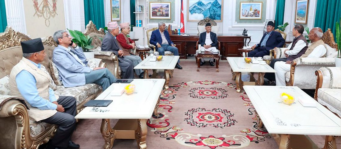 काठमाडौं । संसद्मा देखिएको गतिरोधलगायत विषयमा प्रधानमन्त्री केपी शर्मा ओलीको आह्वानमा प्रमुख दलका शीर्षनेताहरूको छलफल जारी रहेको छ ।
