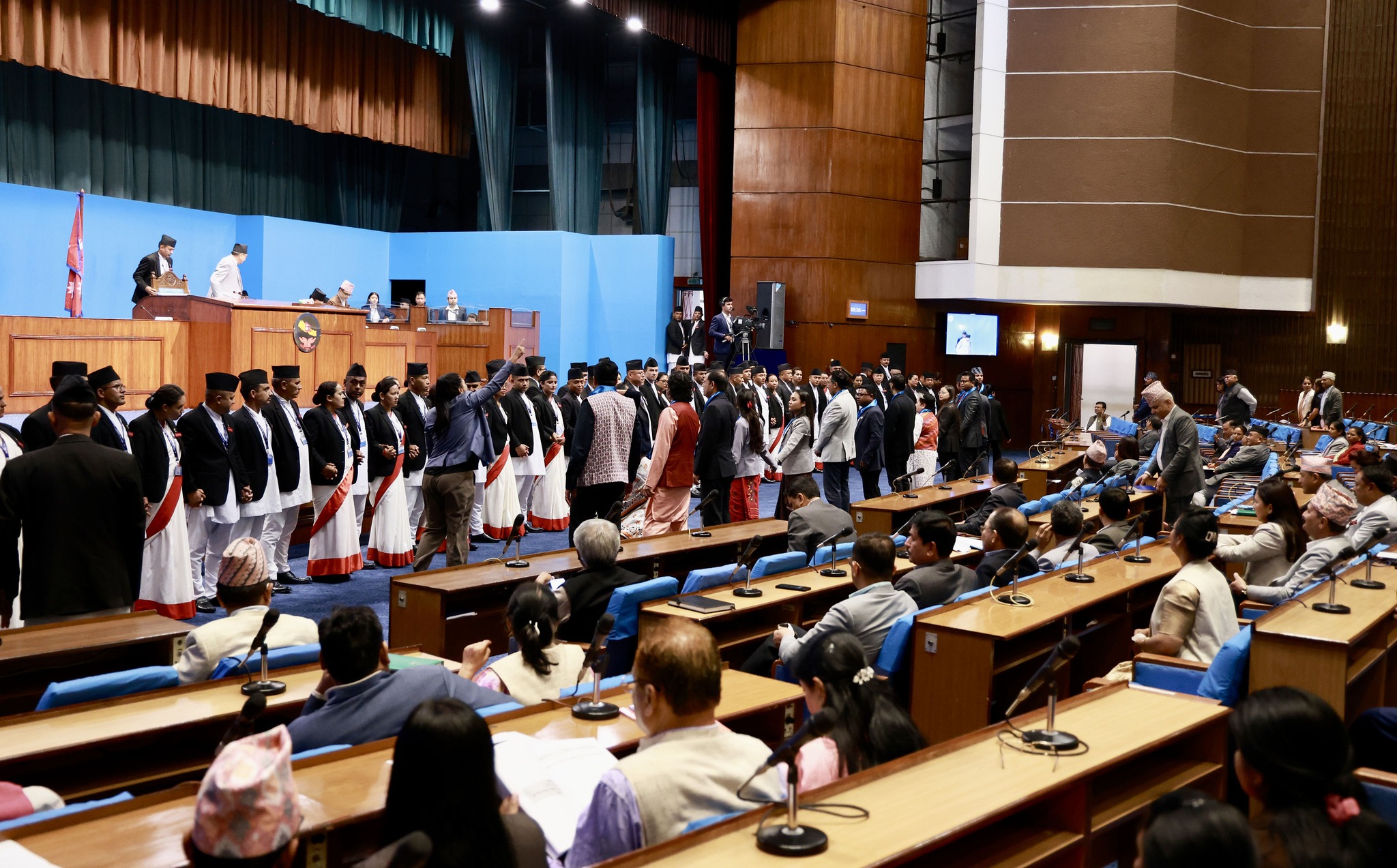 आजको बैठकमा रास्वपाका सांसदहरू निलो रिबन बाँधेर उपस्थित भएपछि नेपाली कांग्रेसले आपत्ति जनाएको थियो। कांग्रेसका प्रमुख सचेतक श्याम घिमिरेले संसदको मर्यादा उल्लंघन भएको भन्दै रास्वपालाई कारबाही गर्न सभामुखलाई आग्रह गरेका थिए।
