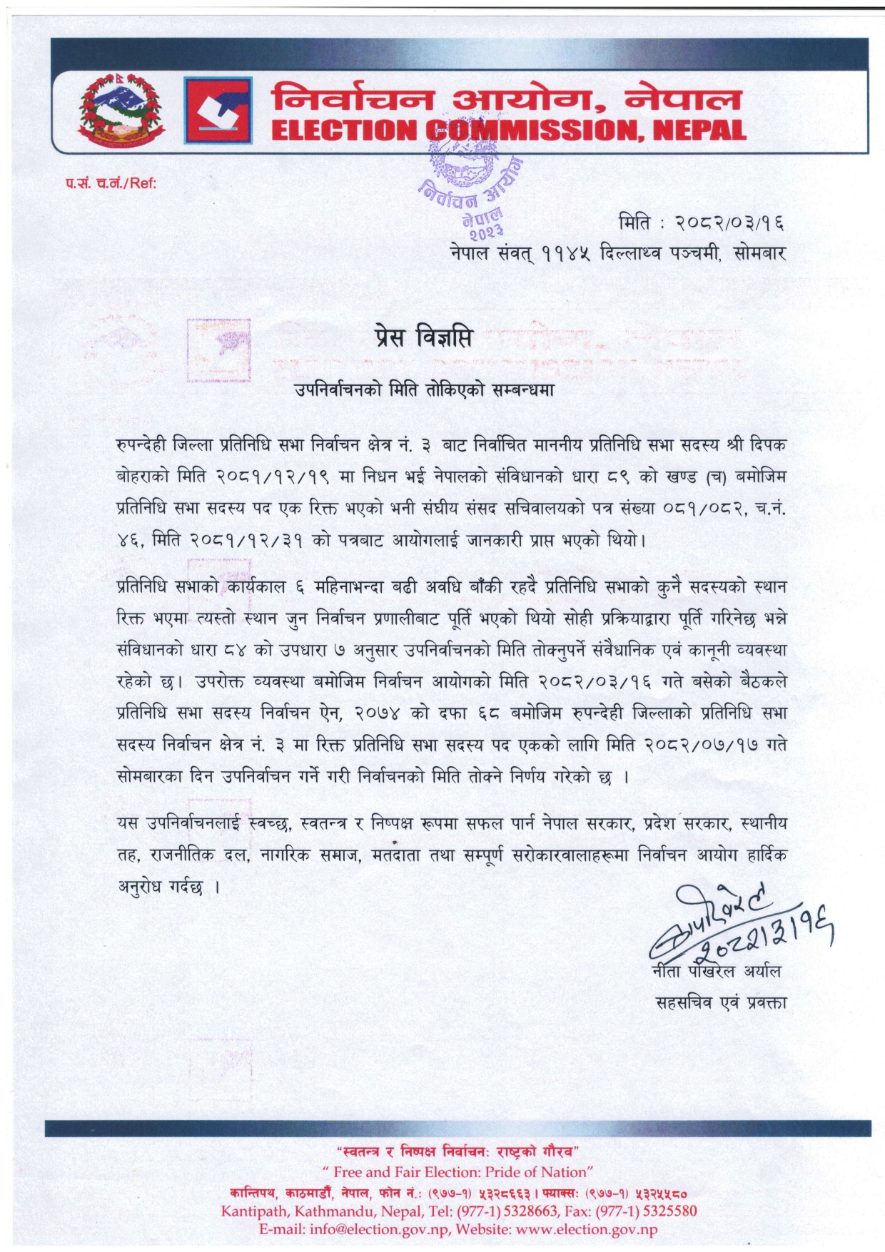 “प्रतिनिधिसभाको कार्यकाल ६ महिना बढी अवधि बाँकी रहँदै कुनै सदस्यको स्थान रिक्त भएमा त्यस्तो स्थान जुन निर्वाचन प्रणालीबाट पूर्ति भएको थियो सोही प्रक्रियाद्वारा पदपूर्ति गरिनेछ,” भन्ने संविधानको धारा ८४ को उपधारा ७ अनुसार उपनिर्वाचनको मिति तोक्नुपर्ने संवैधानिक एवं कानुनी व्यवस्थाअनुसार चैत १७ गते उपनिर्वाचनको मिति तोकिएको आयोगकी सहसचिव एवं प्रवक्ता नीता पोखरेल अर्यालद्वारा जारी विज्ञप्तिमा जनाइएको छ ।