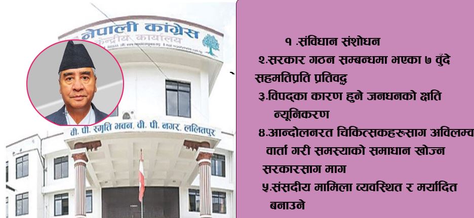 नेपाली कांग्रेसको नेतृत्वमा बनेको संघीय लोकतान्त्रिक गणतन्त्र नेपालको संविधानको रक्षा एवं कार्यान्वयनको मूल दायित्व र जिम्मेवारी हाम्रो नै हो भन्ने कुरामा नेपाली कांग्रेस स्पष्ट र पूर्ण प्रतिवद्ध छ । संविधान कार्यान्वयनको एक दशकमा देखिएका चुनौती र जटिलताको समीक्षा गर्दै यसको गतिशील कार्यान्वयनका लागि समयानुकुल संशोधन गर्नुपर्छ भन्ने विश्वासका साथ नेपाली कांग्रेस र नेकपा (एमाले) बीच भएको ७ बुँदे सहमतिमा “संविधान प्रारम्भ भए पश्चात् अभ्यासमा देखा परेका सबल पक्ष र दुर्बल पक्ष तथा जटिलताको समीक्षा गरी राजनैतिक स्थायित्वका लागि संविधानमा आवश्यक संशोधन र तदनुकुलको कानून निर्माण गर्ने विषयलाई प्राथमिकता दिने” भन्ने विषय महत्वका साथ उल्लेख गरिएको नेपाली कांग्रेस स्मरण गर्दछ । तसर्थ, संविधान संशोधनको विषयलाई सार्थक निष्कर्षमा पु¥याउन नेपाली कांग्रेसले एक कार्यदल गठन गर्ने निर्णय गर्दछ । कार्यदलले पार्टीभित्र संविधान संशोधनका विषयमा छलफल चलाउनेछ । संविधान निर्माणमा सहकार्य गरेका राजनीतिक दलहरू एवं अन्य राजनीतिक दलहरु, संविधान निर्माणमा योगदान गरेका विज्ञ, विशेषज्ञ एवं सरोकारवाला नागरिक समाजसँग संवाद गर्नेछ ।