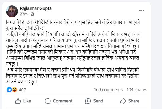 मन्त्री गुप्ताले आफूमाथि लागेको आरोपको निष्पक्ष अनुसन्धानका लागि मार्ग खुलोस् भनेर पद त्याग गरेको बताए । “सत्यतथ्य बाहिर ल्याउन अनुसन्धान सहज होस् भनेर मैले राजीनामा दिएको हुँ”, गुप्ताले भने ।
