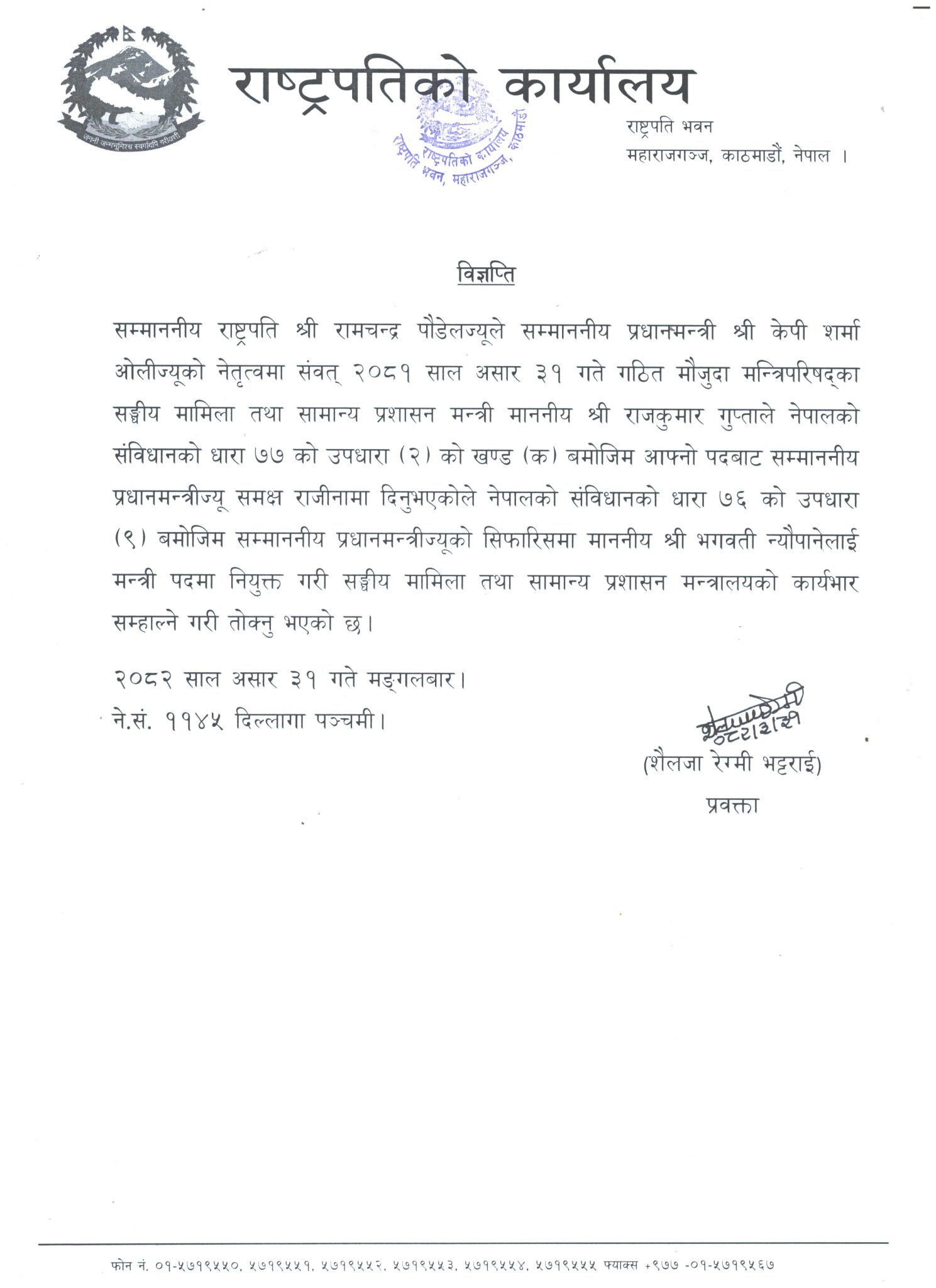 राष्ट्रपतिको कार्यालयबाट जारी विज्ञप्तिमा उल्लेख गरिएअनुसार नेपालको संविधानको धारा ७७ को उपधारा (२) को खण्ड (क) बमोजिम गुप्ताले प्रधानमन्त्री समक्ष राजीनामा दिएपछि संविधानको धारा ७६ को उपधारा (९) बमोजिम न्यौपानेलाई मन्त्री पदमा नियुक्त गरिएको हो।