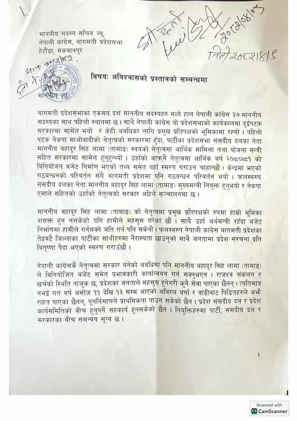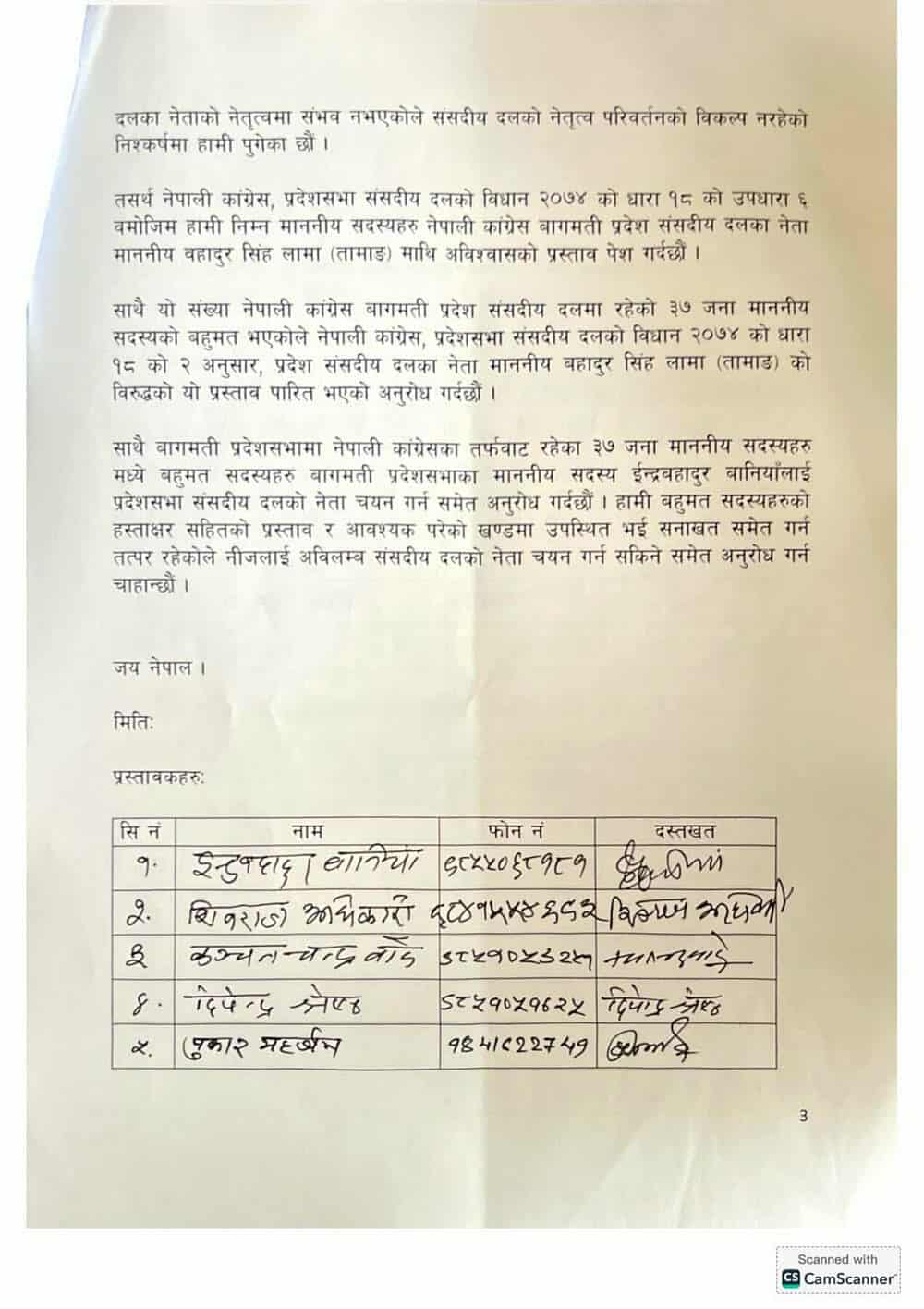 शुक्रबार नेपाली कांग्रेस बागमती प्रदेश संसदीय दलको कार्यालयमा लामाविरूद्ध अविश्वासको प्रस्ताव दर्ता भएको काग्रेस प्रदेशसभाका एक सदस्यले बताएका छन्। अविश्वासको प्रस्तावमा नेपाली कांग्रेसका २१ सांसदहरूले हस्ताक्षर गरेका छन्।