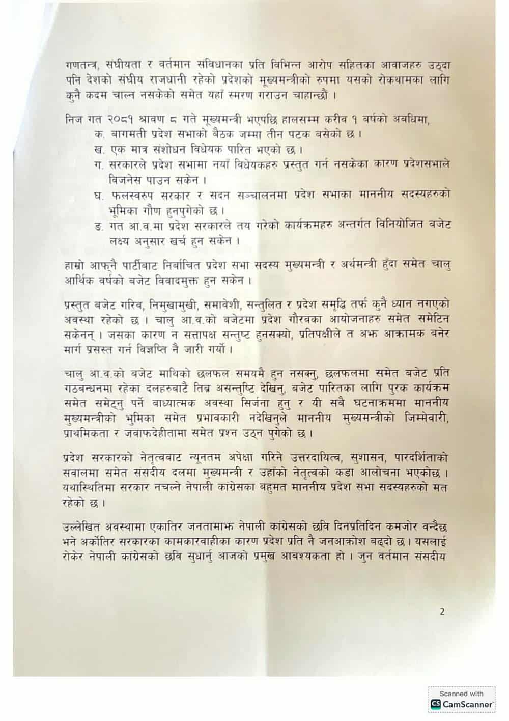 कांग्रेस संसदीय दलको विधान अनुसार संसदीय दलको नेता नै मुख्यमन्त्री रहन्छन्। अविश्वासको प्रस्तावले सार्थकता पाए बागमती प्रदेश सरकारमा नेतृत्व परिवर्तन हुनेछ। बागमती प्रदेशमा कांग्रेसबाट ३७ जना निर्वाचित सदस्य छन्। कांग्रेस बागमती प्रदेशसभाको सबै भन्दा ठूलो दल हो।