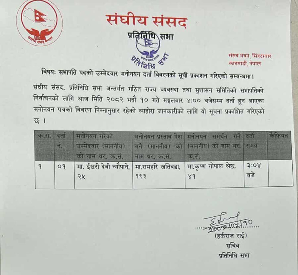 काठमाडौं । राज्य व्यवस्था तथा शासन समितिको सभापतिमा नेपाली कांग्रेसकी सांसद ईश्वरी न्यौपानेको मात्र मनोनयन दर्ता भएको छ ।