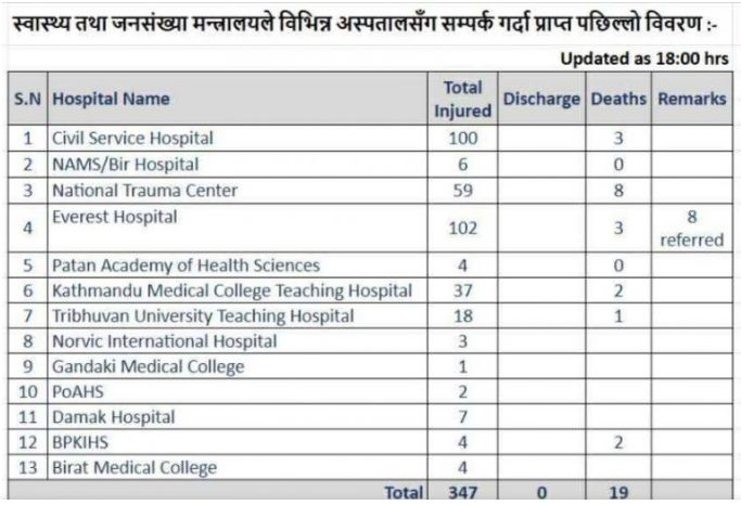 सोमबार भएको जेनजी प्रदर्शन हिंसात्मक बनेको थियो। यस घटनामा अहिलेसम्म १९ जनाले ज्यान गुमाइसकेका छन्। यस्तै २५६ जना भन्दा बढी घाइते छन् । उनीहरुको देशभरीका विभिन्न अस्पतालमा उपचार भइरहेको छ ।प्रर्दशनका क्रममा निकै ठूलो भौतिक तथा तथा मानवीय क्षेति भएको छ ।सरकारले विरामी र घाइतेहरुको निःशुल्क उपचार गर्ने भएको छ ।