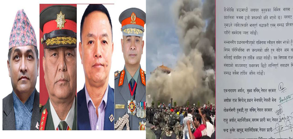 मुख्यसचिव एकनारायण अर्याल, प्रधान सेनापति अशोकराज सिग्देल, गृहसचिव गोकर्णमणी दुवाडी, सशस्त्रका आईजीपी राजु अर्याल, नेपाल प्रहरीका आईजीपी चन्द्रकुवेर खापुङ र राष्ट्रिय अनुसन्धान विभाग प्रमुख हुतराज थापाले अपिल जारी गर्दै राजनीतिक संवादको माध्यमबाट समाधान निकाल्न आग्रह गरेका हुन।
