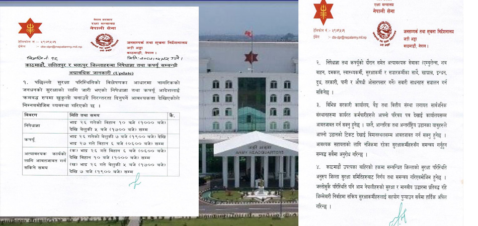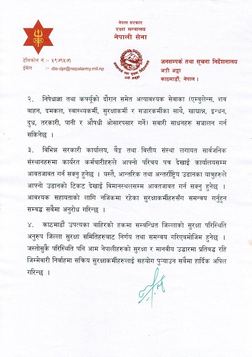 सेनाले जनाएको छ कि कर्फ्यूका दौरान एम्बुलेन्स, शव वाहन, दमकल, स्वास्थ्यकर्मी, सुरक्षाकर्मी, सञ्चारकर्मी र खाद्यान्न, इन्धन, दुध, तरकारी, पानी, औषधी ओसारपसार गर्ने सवारी साधन संचालन गर्न सकिनेछ।